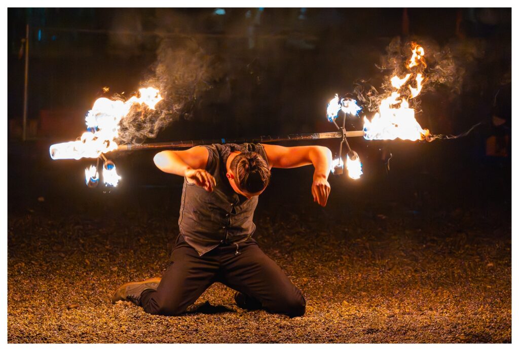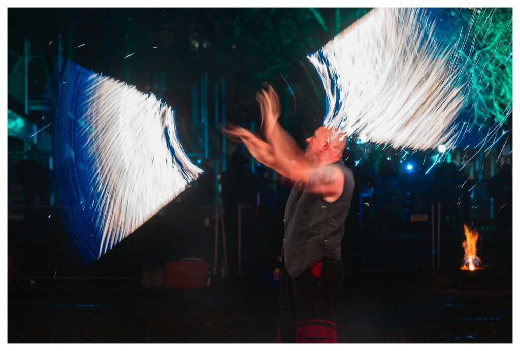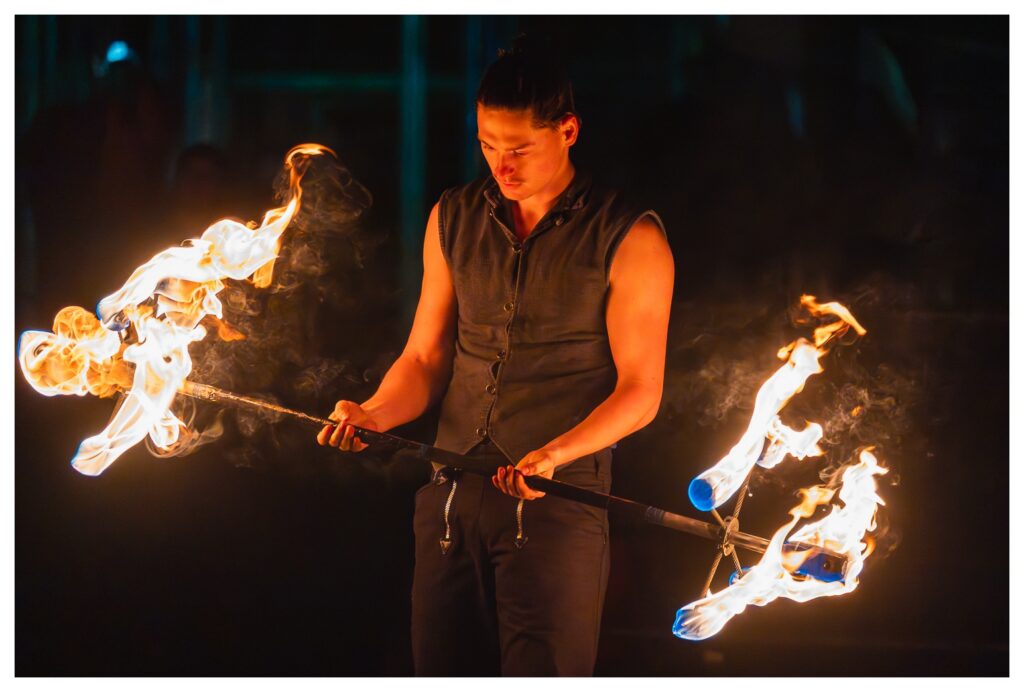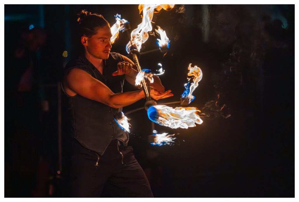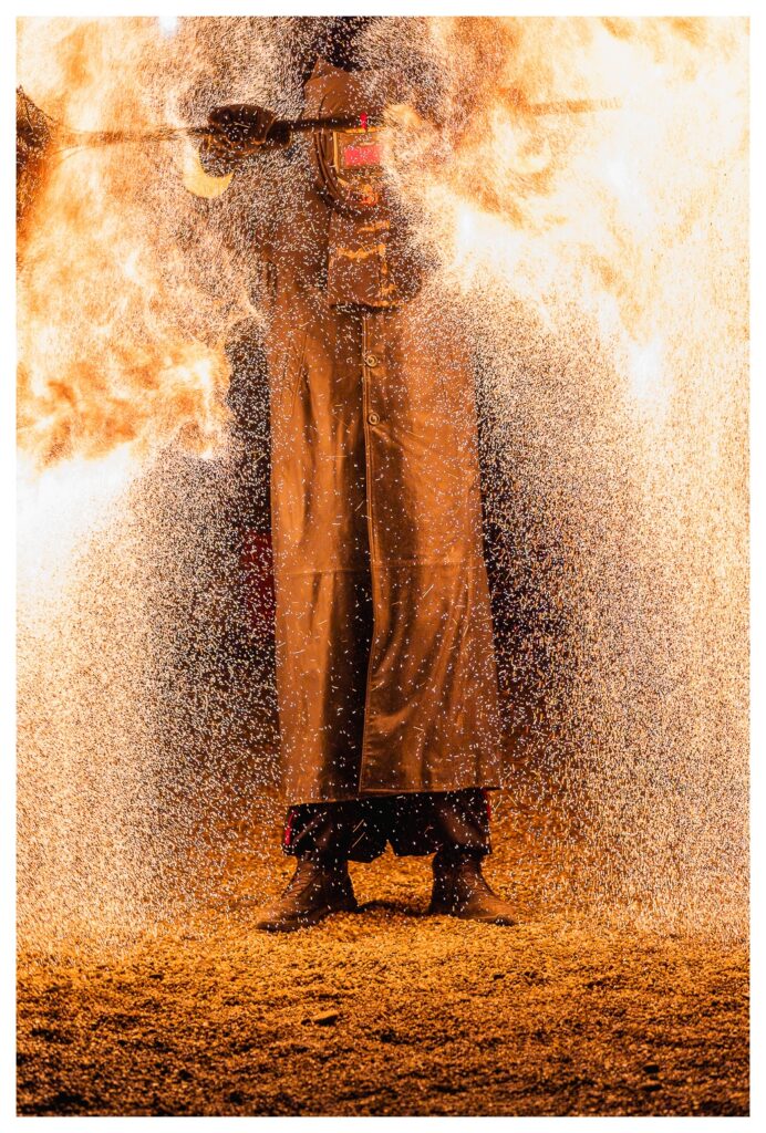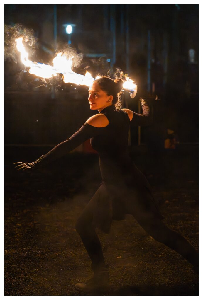 Die schnellen Bewegungen der Künstler erfordern eigentlich Verschlusszeiten wie z.B. 1/200 Sekunde (eigentlich noch kürzer), um Bewegungsunschärfe im Bild zu vermeiden. Wenn wir aber ein Foto einer Flamme sehen, das mit 1/200 Sekunde Belichtungszeit aufgenommen wurde, wirkt das für uns vollig ungewohnt und verglichen zur Wahrnehmung vor Ort völlig mickrig. Das liegt daran, das Flammen schnell sind und flackern, was wir vor Ort aber gar nicht komplett wahrnehmen können, weil unser Sehapparat vergleichsweise träge ist. Um die Flammen also spektakulär wirken zu lassen, müsste man diese länger belichten als den Tänzer, was aber natürlich nicht geht.