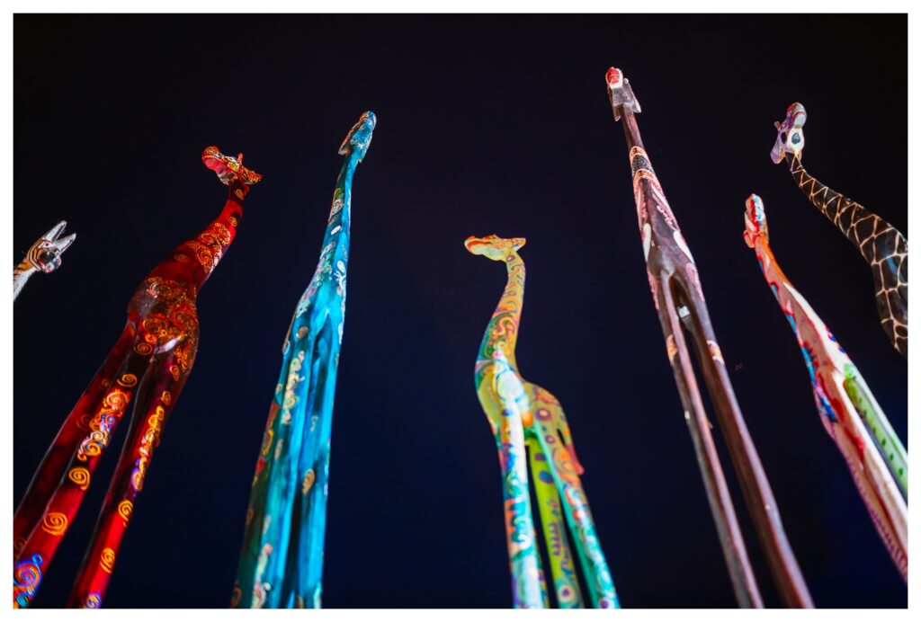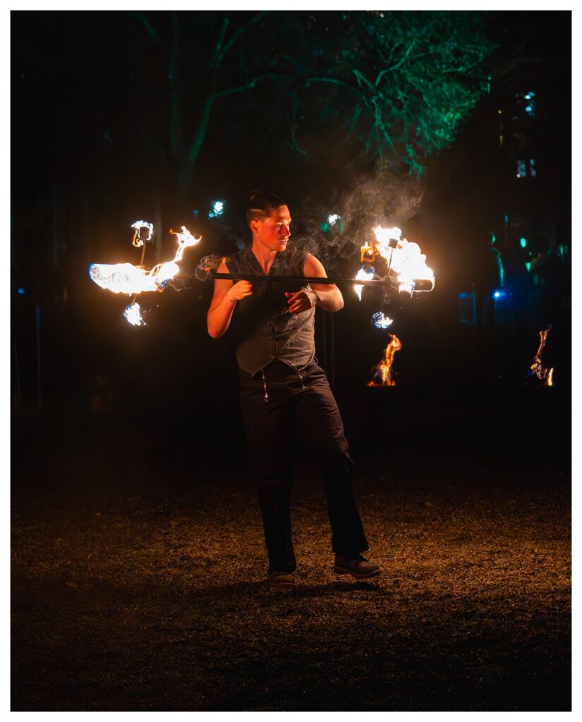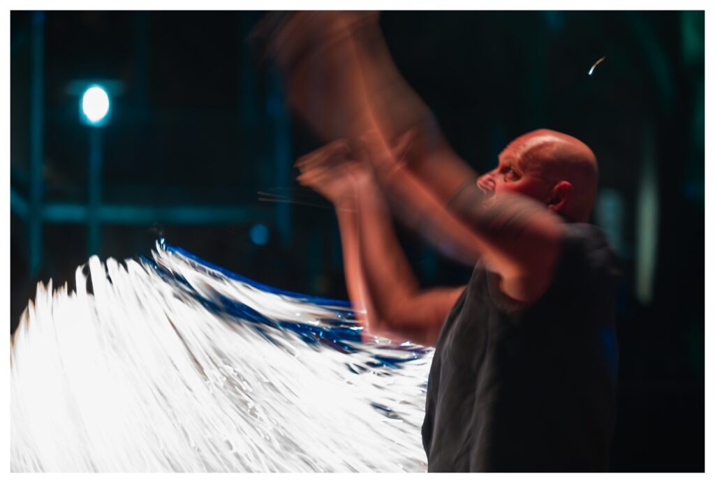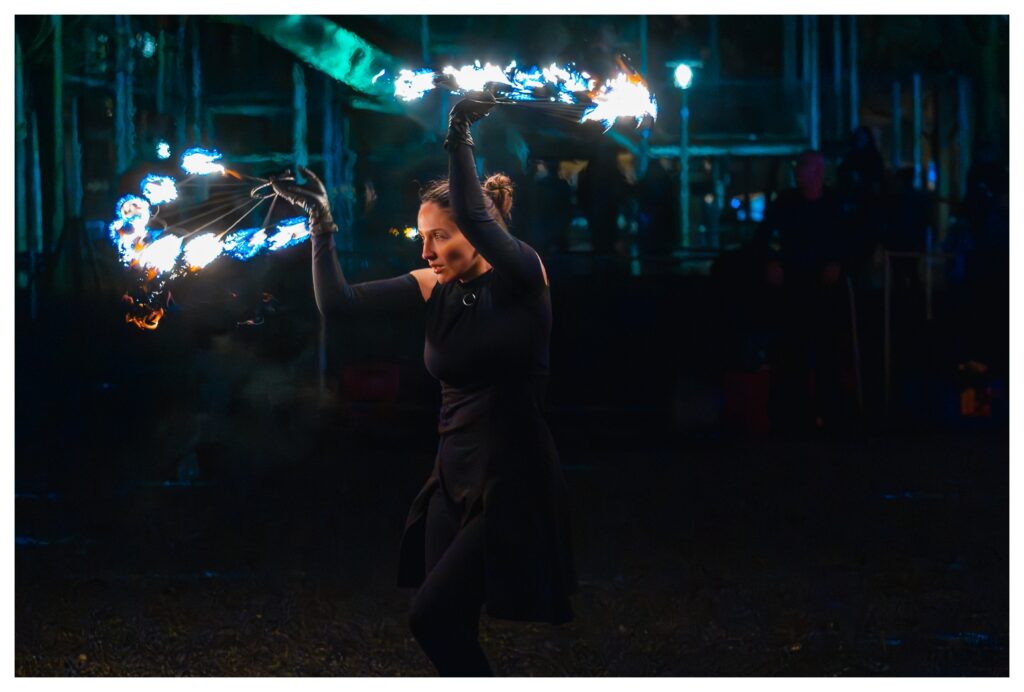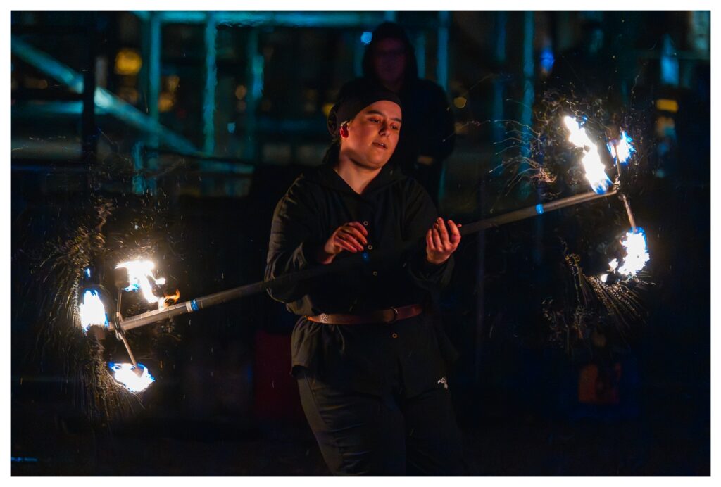 Die schnellen Bewegungen der Künstler erfordern eigentlich Verschlusszeiten wie z.B. 1/200 Sekunde (eigentlich noch kürzer), um Bewegungsunschärfe im Bild zu vermeiden. Wenn wir aber ein Foto einer Flamme sehen, das mit 1/200 Sekunde Belichtungszeit aufgenommen wurde, wirkt das für uns vollig ungewohnt und verglichen zur Wahrnehmung vor Ort völlig mickrig. Das liegt daran, das Flammen schnell sind und flackern, was wir vor Ort aber gar nicht komplett wahrnehmen können, weil unser Sehapparat vergleichsweise träge ist. Um die Flammen also spektakulär wirken zu lassen, müsste man diese länger belichten als den Tänzer, was aber natürlich nicht geht.
