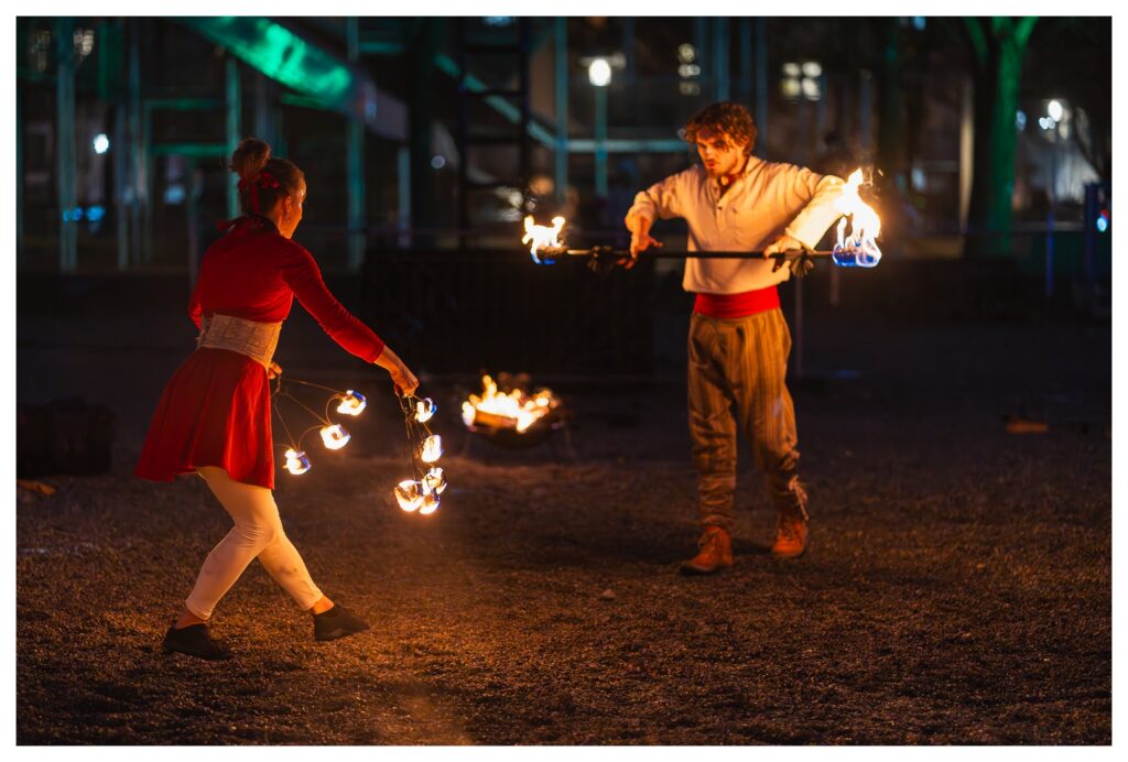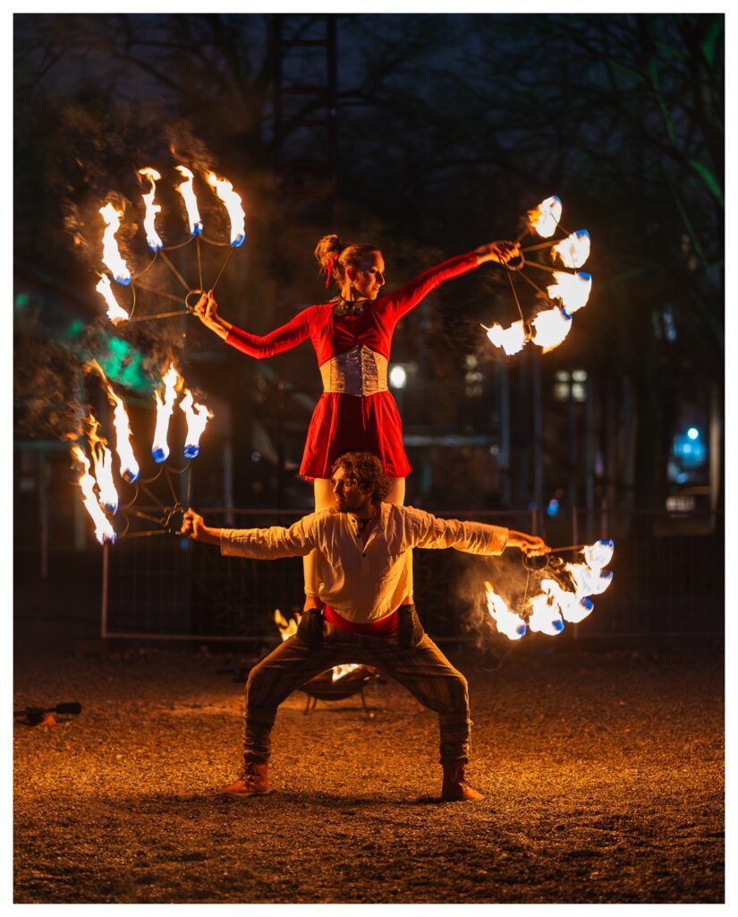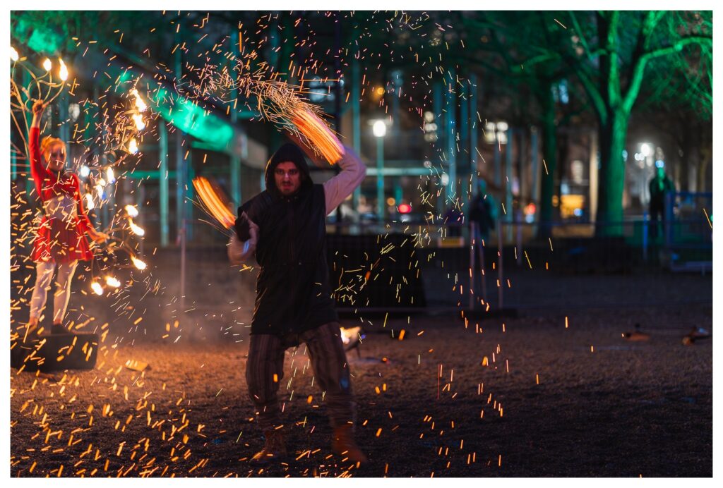 Nach der letzten, recht erfolgreichen Ernte infernöser Bilder am Dienstag habe ich heute – wie gesagt, auf dem Tollwood finden täglich Vorführungen mit wechselnden Künstlern statt – einen etwas anderen Ansatz ausprobiert die Show zu fotografieren: Mir war schon neulich vor Ort aufgefallen, dass ich die Reichweite des 70–300 mm eigentlich gar nicht voll brauche; die meisten Bilder waren um die 100 mm aufgenommen. Also habe ich heute das 85 mm f/1.8 aus dem Schrank gekramt und komplett offenblendig fotografiert.