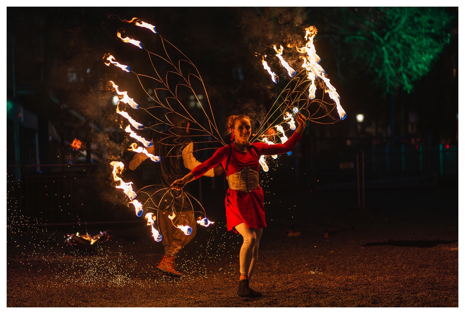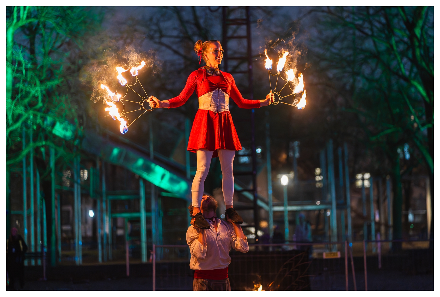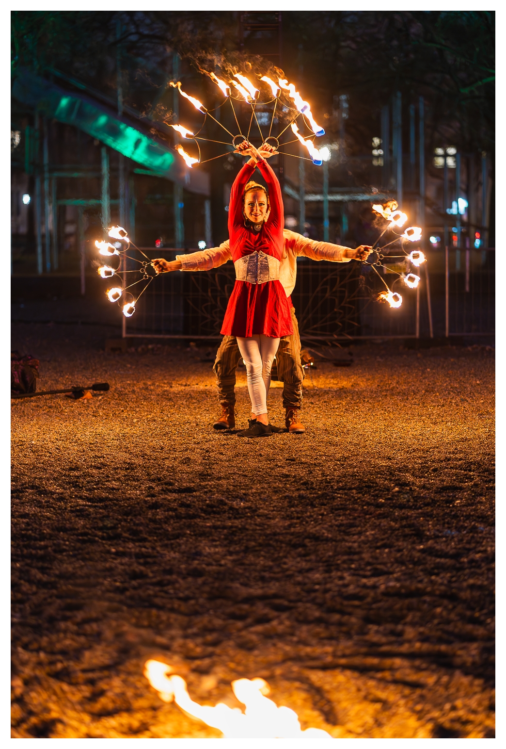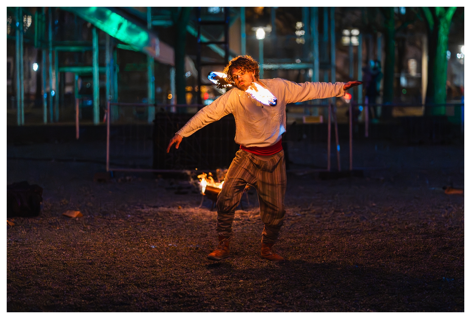Nach der letzten, recht erfolgreichen Ernte infernöser Bilder am Dienstag habe ich heute – wie gesagt, auf dem Tollwood finden täglich Vorführungen mit wechselnden Künstlern statt – einen etwas anderen Ansatz ausprobiert die Show zu fotografieren: Mir war schon neulich vor Ort aufgefallen, dass ich die Reichweite des 70–300 mm eigentlich gar nicht voll brauche; die meisten Bilder waren um die 100 mm aufgenommen. Also habe ich heute das 85 mm f/1.8 aus dem Schrank gekramt und komplett offenblendig fotografiert.