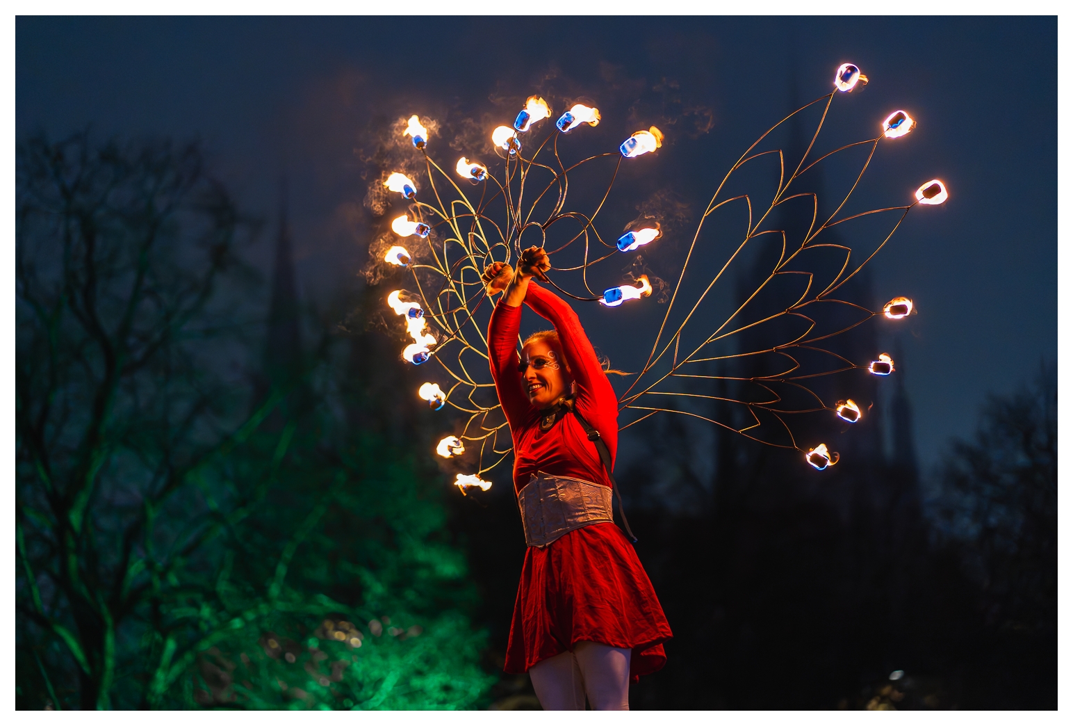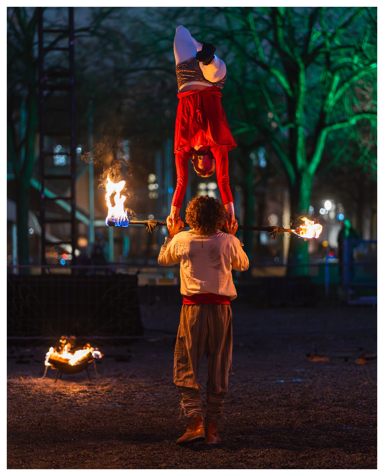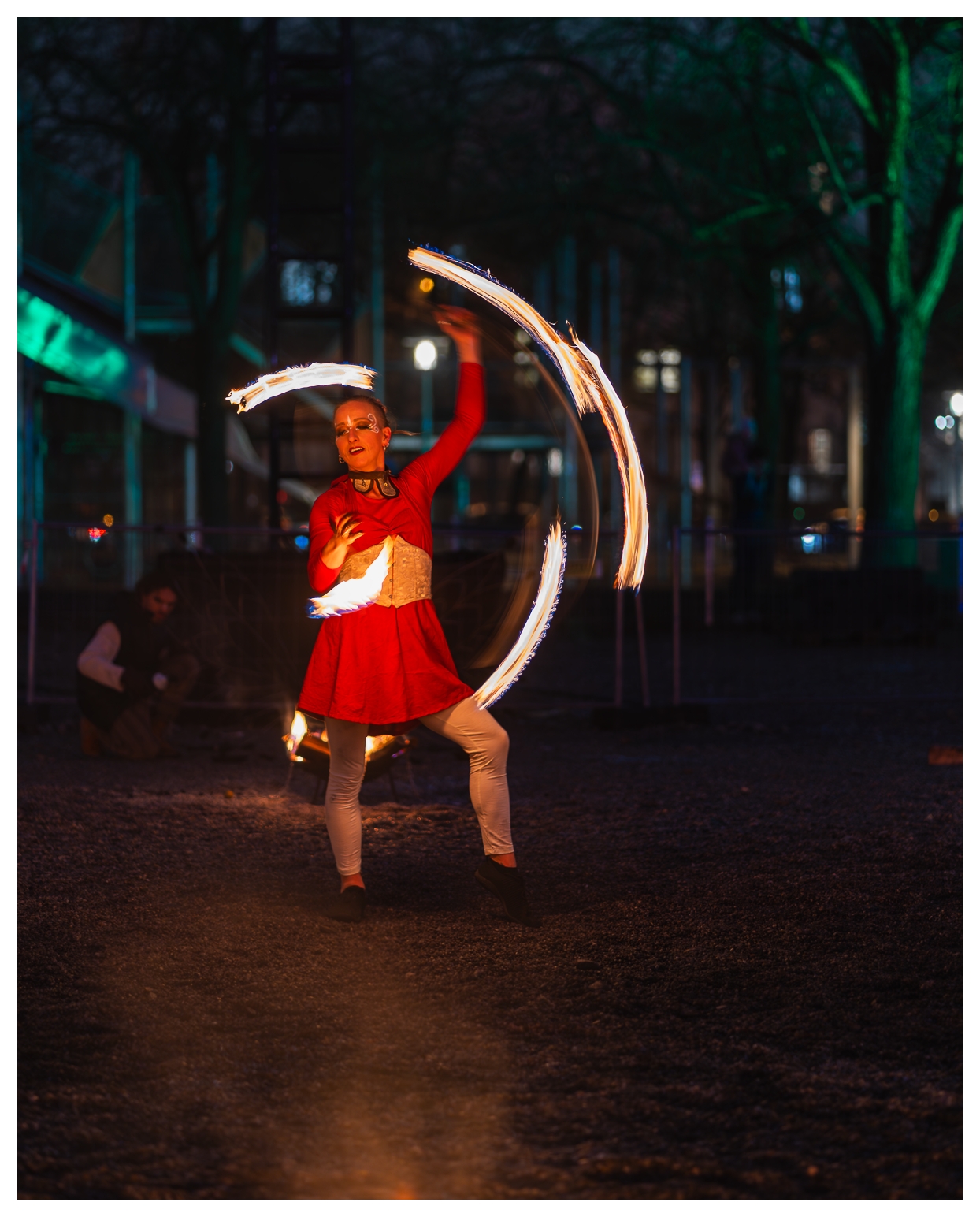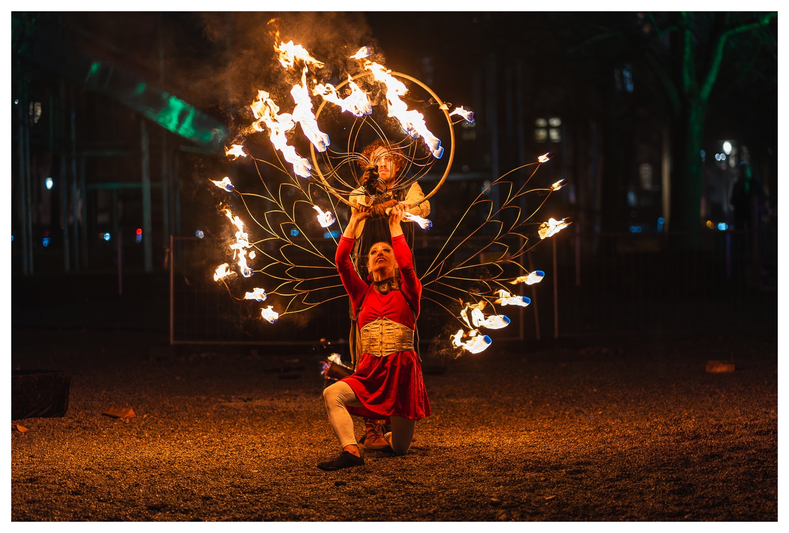 Nach der letzten, recht erfolgreichen Ernte infernöser Bilder am Dienstag habe ich heute – wie gesagt, auf dem Tollwood finden täglich Vorführungen mit wechselnden Künstlern statt – einen etwas anderen Ansatz ausprobiert die Show zu fotografieren: Mir war schon neulich vor Ort aufgefallen, dass ich die Reichweite des 70–300 mm eigentlich gar nicht voll brauche; die meisten Bilder waren um die 100 mm aufgenommen. Also habe ich heute das 85 mm f/1.8 aus dem Schrank gekramt und komplett offenblendig fotografiert.