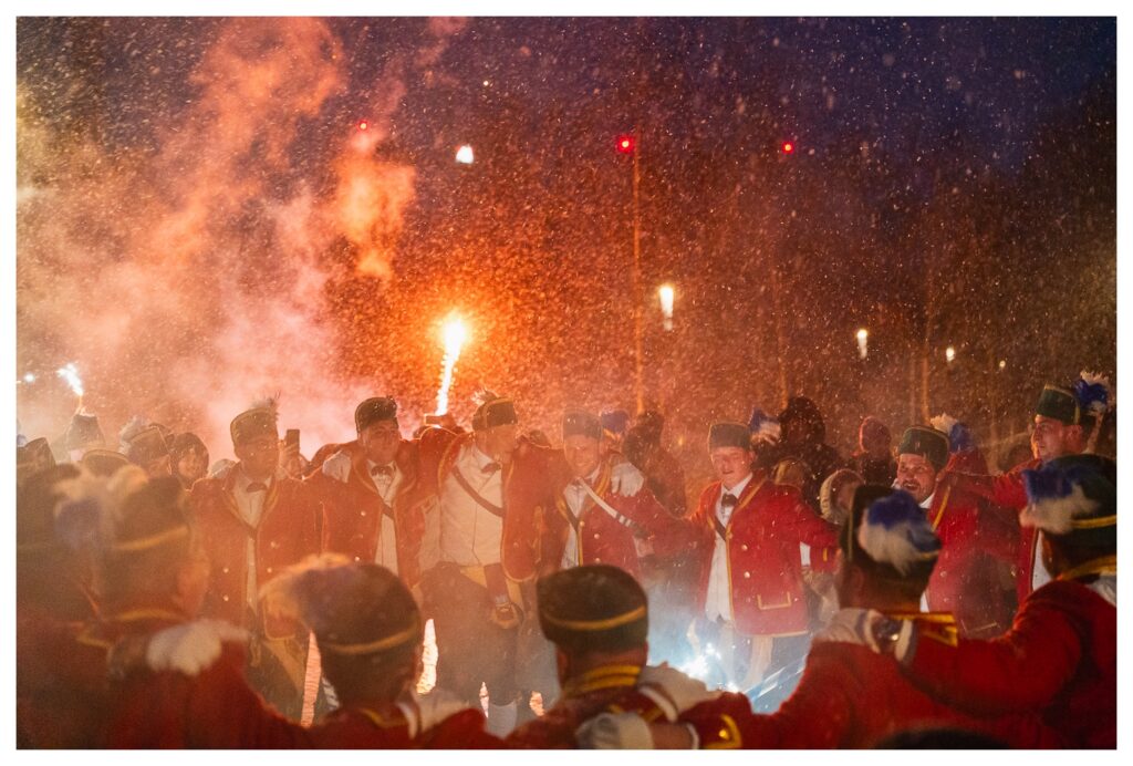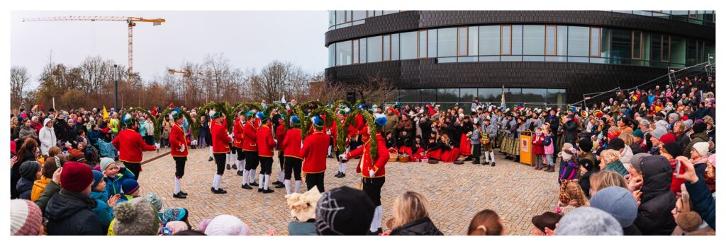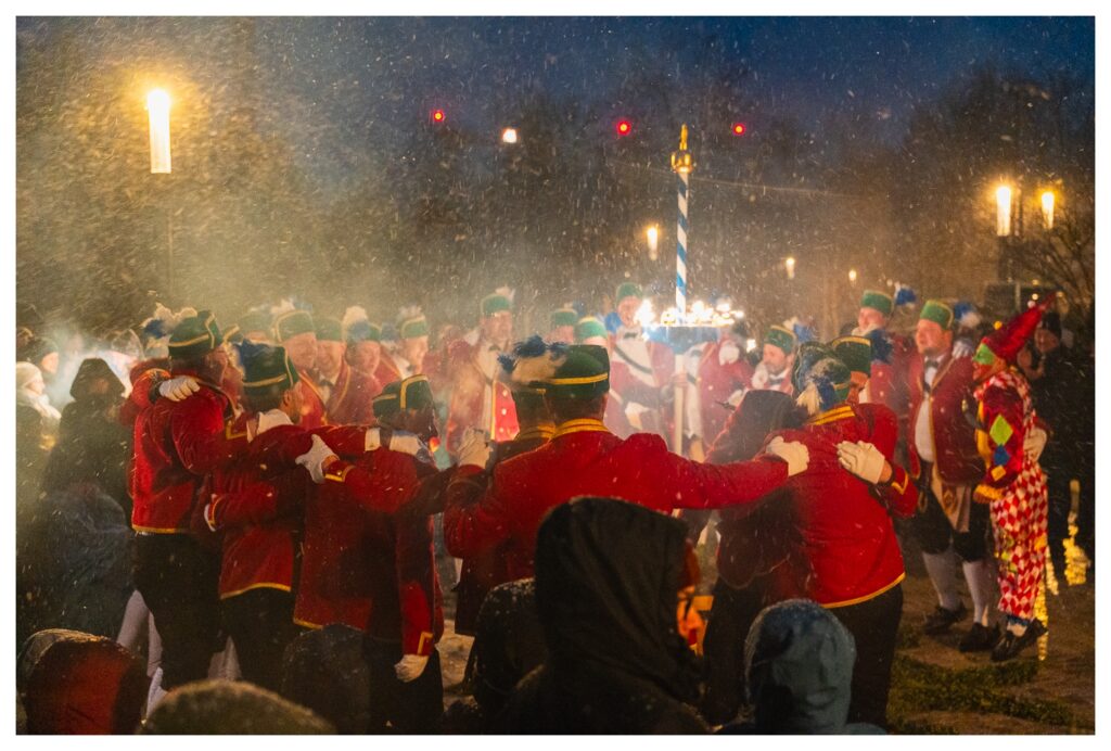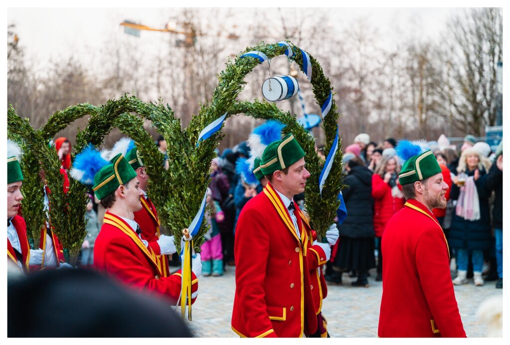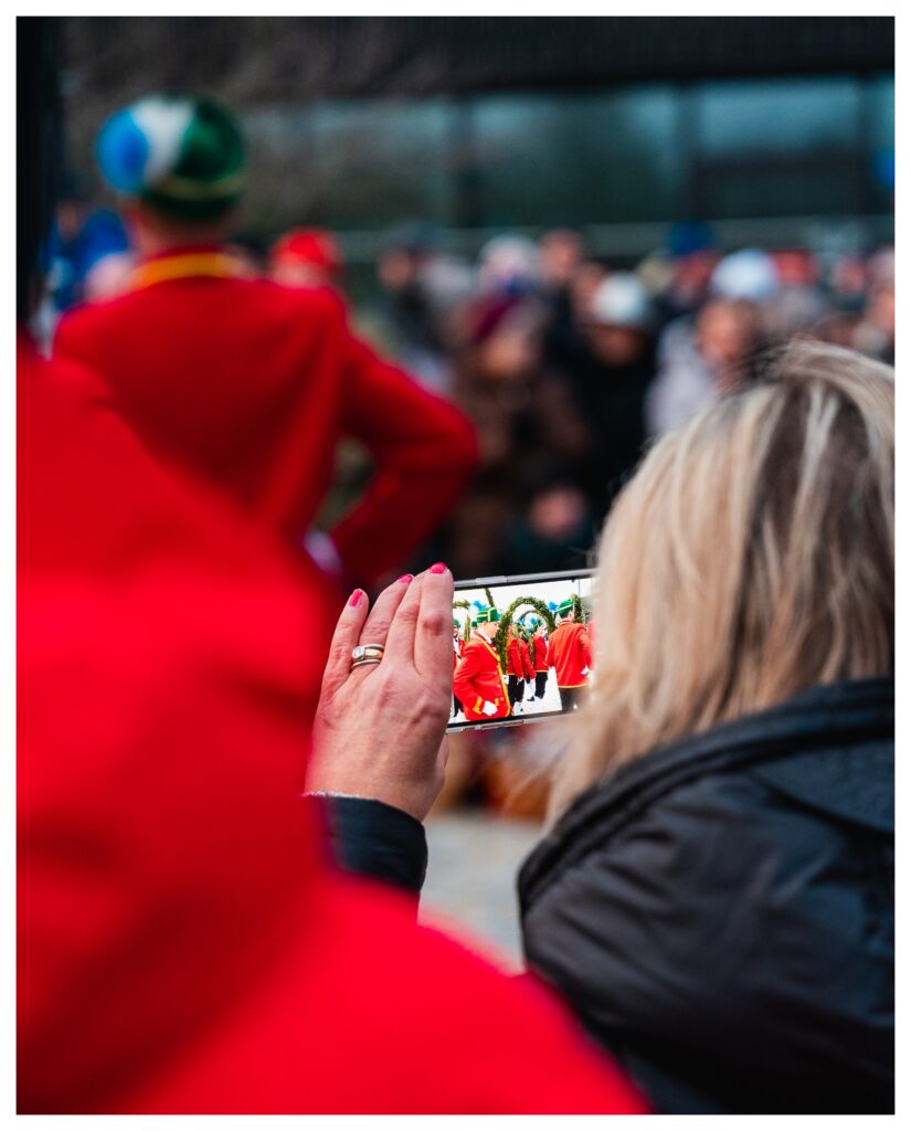 Trotz längerer Zeit im Münchener Outback kannte ich diesen Brauch bis zu diesem Jahr nicht bzw. hatte nie so ein Happening live gesehen. Wie das kommen konnte, war mir nicht klar, weil die Schäffler und die Kapelle in den letzten Wochen im Ort und im Landkreis quasi omnipräsent waren und (ich glaube) 120 Auftritte vor Schulen, Altenheimen, …, aber auch bei privaten Auftraggebern hinlegten. Eine bemerkenswerte Leistung.