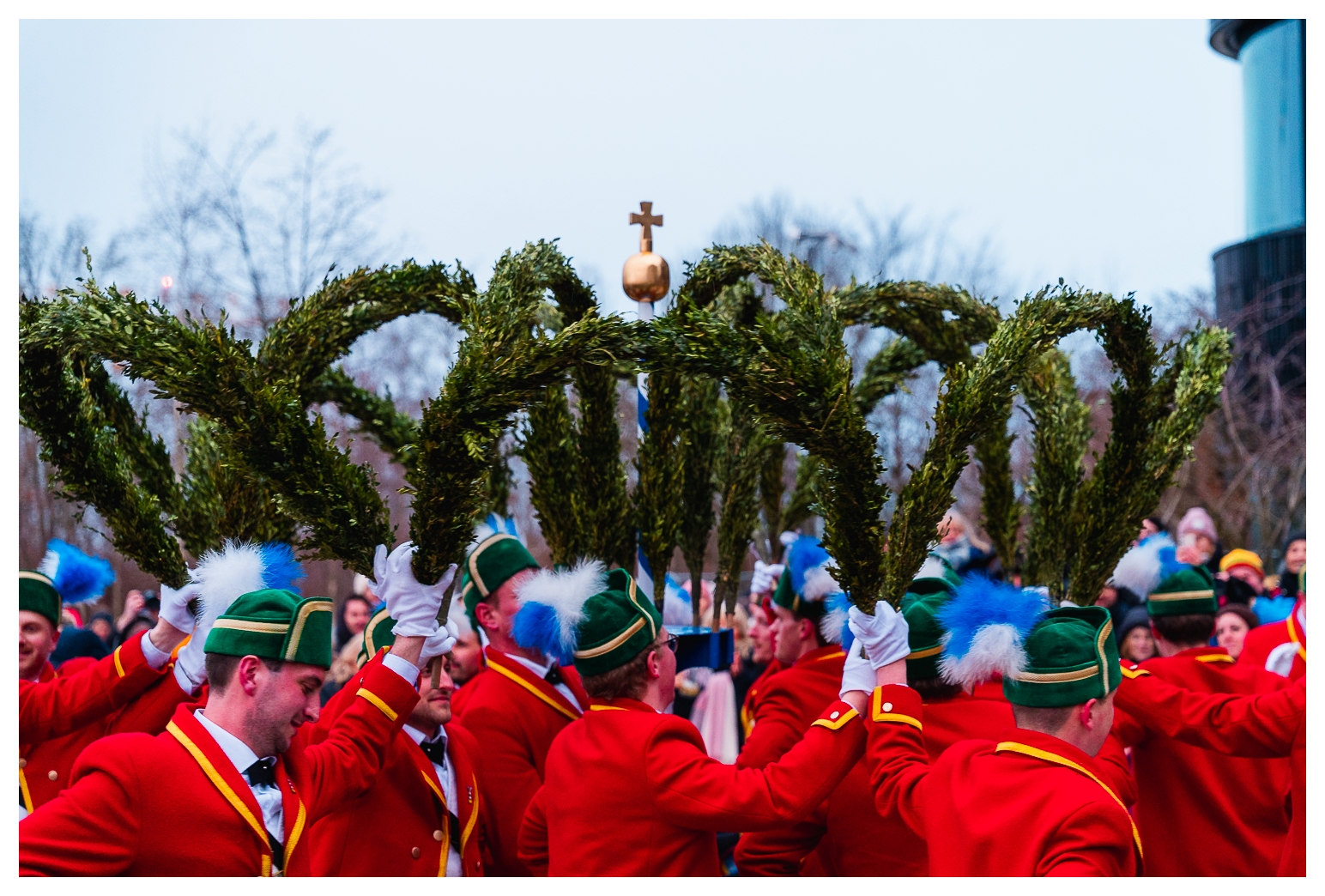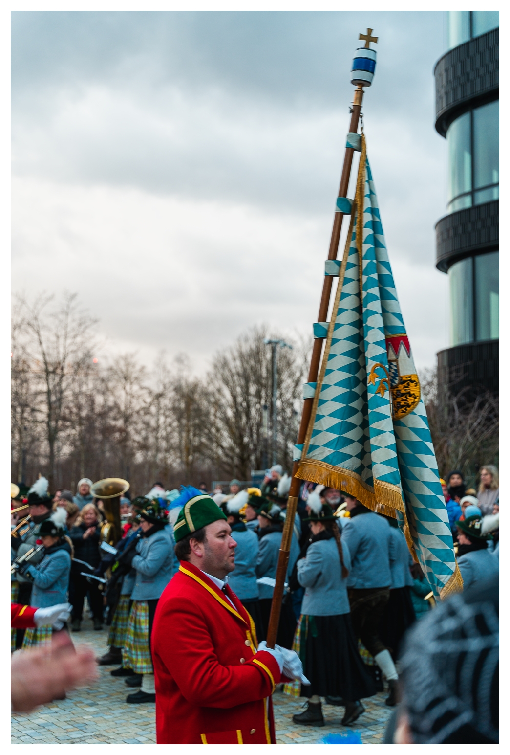 Trotz längerer Zeit im Münchener Outback kannte ich diesen Brauch bis zu diesem Jahr nicht bzw. hatte nie so ein Happening live gesehen. Wie das kommen konnte, war mir nicht klar, weil die Schäffler und die Kapelle in den letzten Wochen im Ort und im Landkreis quasi omnipräsent waren und (ich glaube) 120 Auftritte vor Schulen, Altenheimen, …, aber auch bei privaten Auftraggebern hinlegten. Eine bemerkenswerte Leistung.