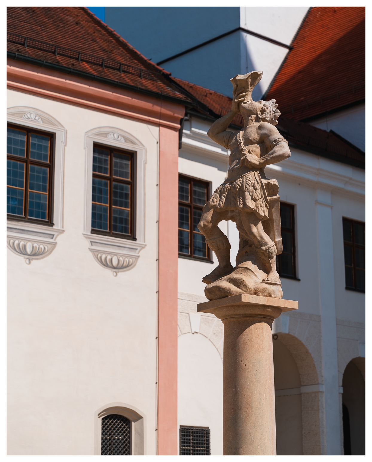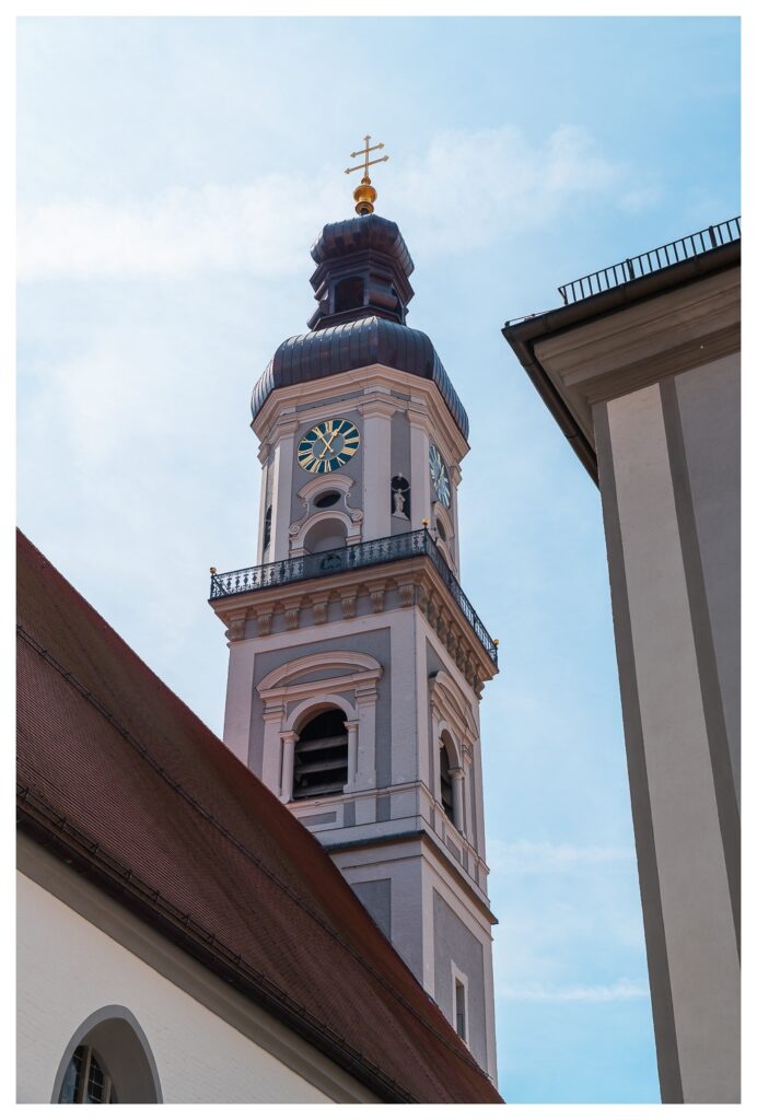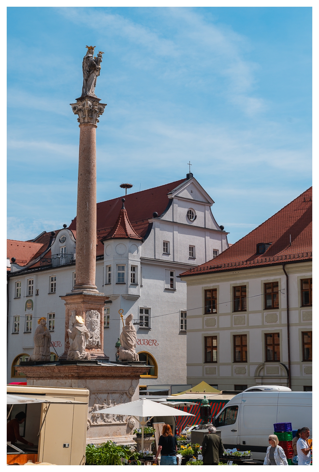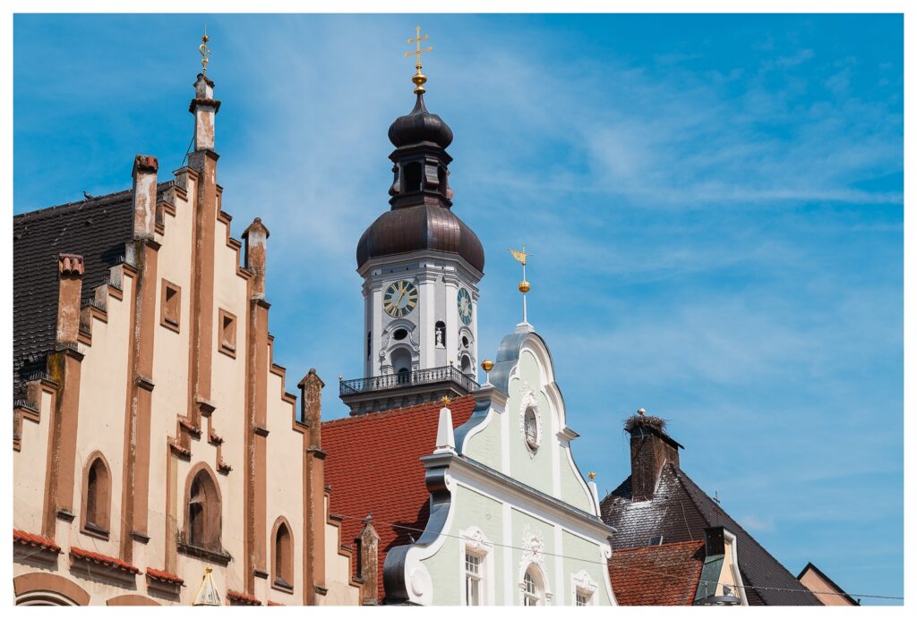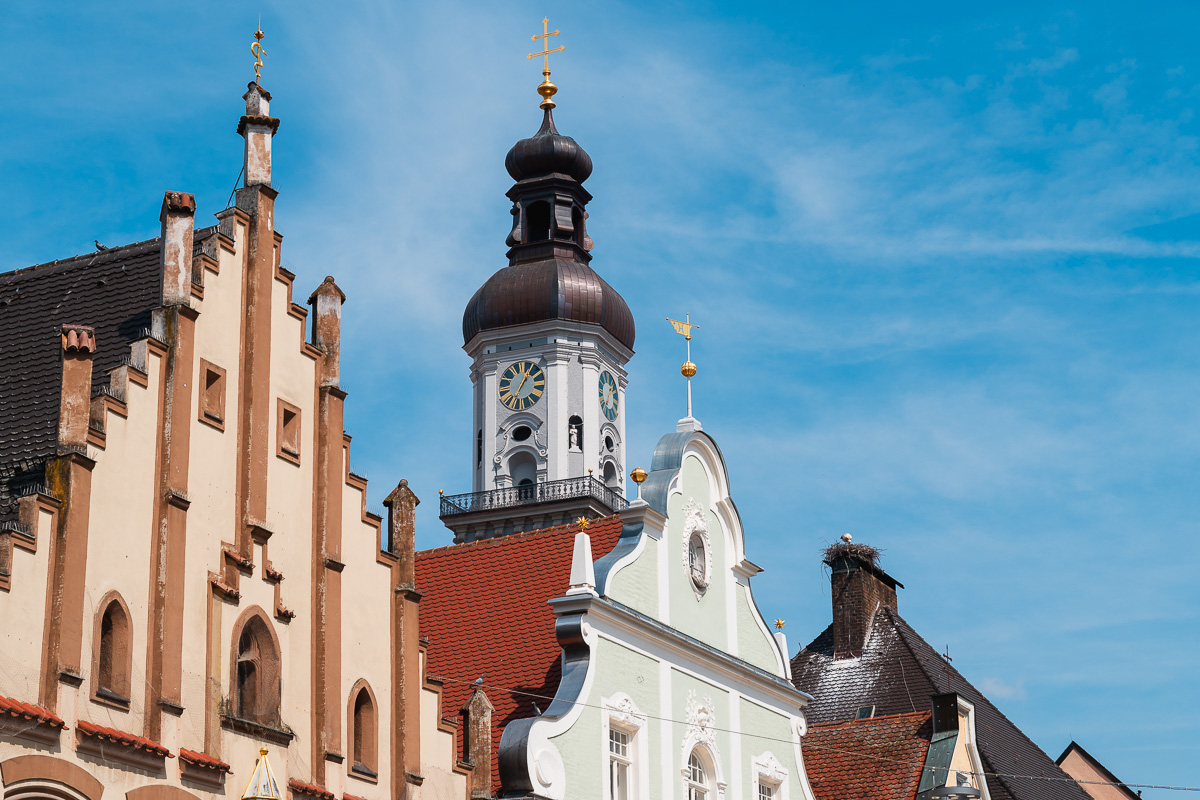 Eigentlich erhoffte ich mir, das etwas planlose Jungstorchenpärchen zu fotografieren, das auf der Mariensäule am Marktplatz angefangen hatte, ein Nest zu bauen. Leider wurde dieses Nest wohl erst vor zwei, drei, vier Tagen auf ein nahes Haus umgesiedelt, weil so ein Storchennest gern ein paar hundert Kilo auf die Waage bringen kann, was die gute Mariensäule wohl nicht unbeschadet verkraftet hätte. Und wenn so ein Vogel die Mariensäule demoliert, versteht der Oberbayer halt keinen Spaß. Gar nicht.