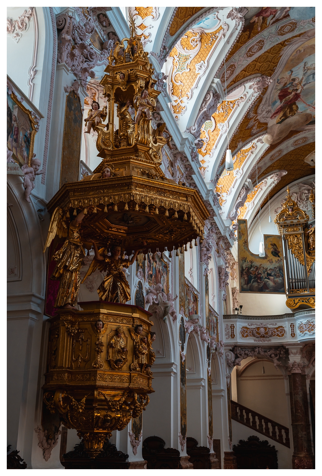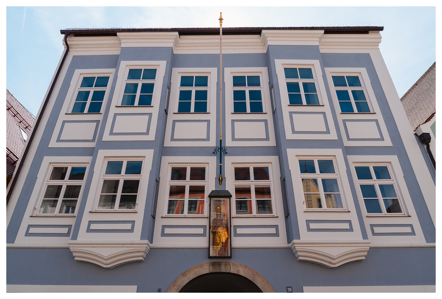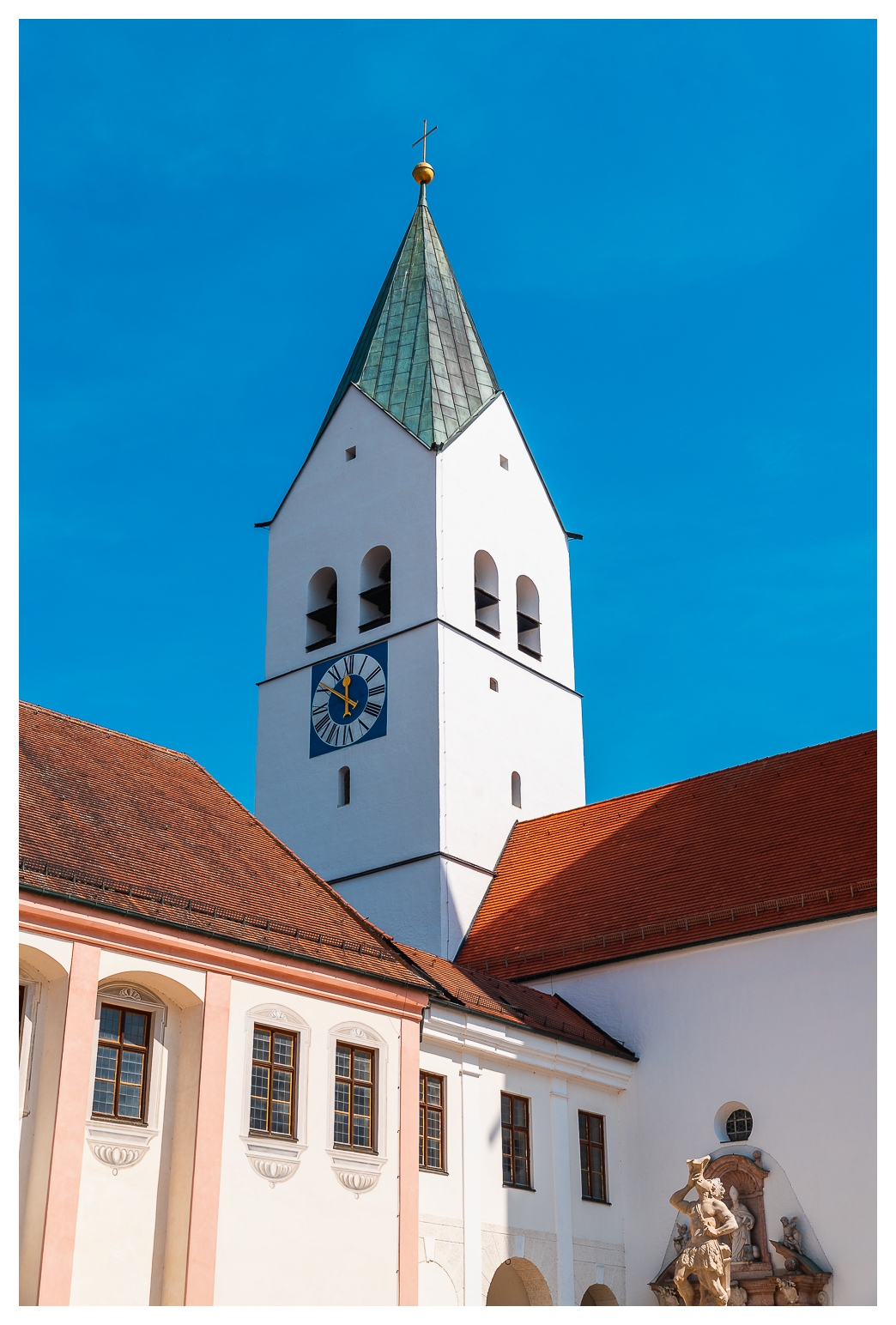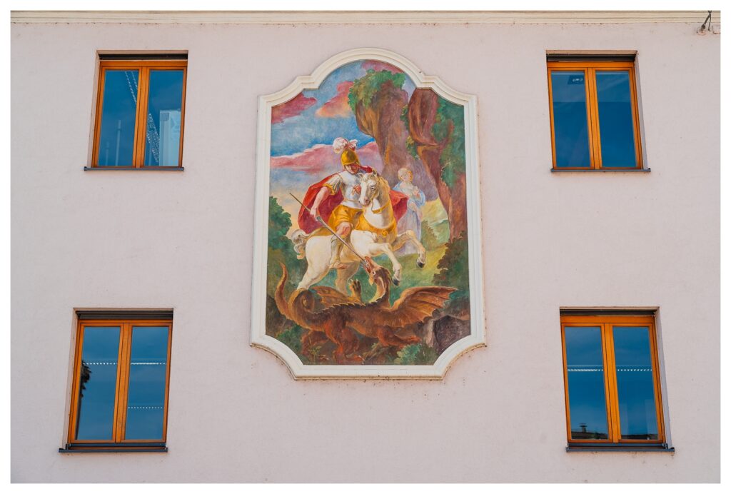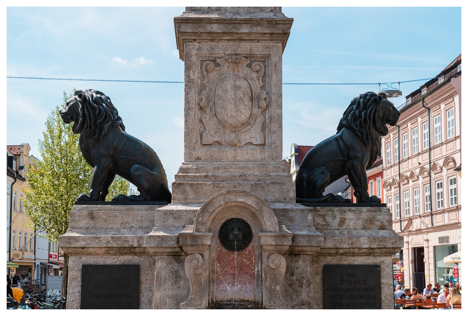 Eigentlich erhoffte ich mir, das etwas planlose Jungstorchenpärchen zu fotografieren, das auf der Mariensäule am Marktplatz angefangen hatte, ein Nest zu bauen. Leider wurde dieses Nest wohl erst vor zwei, drei, vier Tagen auf ein nahes Haus umgesiedelt, weil so ein Storchennest gern ein paar hundert Kilo auf die Waage bringen kann, was die gute Mariensäule wohl nicht unbeschadet verkraftet hätte. Und wenn so ein Vogel die Mariensäule demoliert, versteht der Oberbayer halt keinen Spaß. Gar nicht.